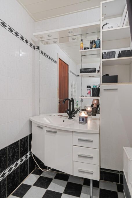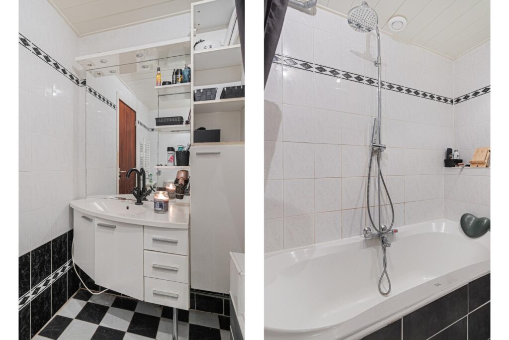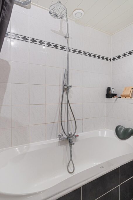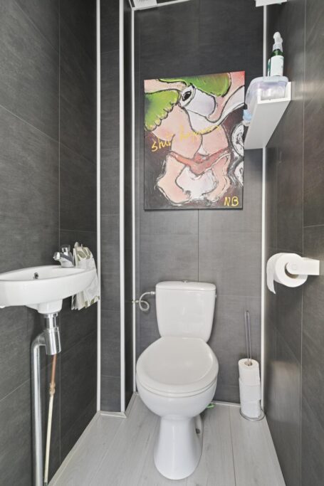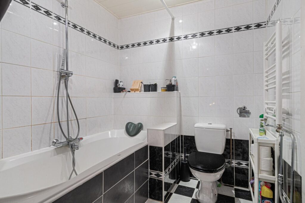 Eerste verdieping: Via de trap in de woonkamer kom je op de overloop met toegang tot twee slaapkamers, de badkamer en de trap naar de zolderverdieping. De badkamer is volledig betegeld in zwart en wit is voorzien van een bad met douche, wastafelmeubel en een tweede toilet.