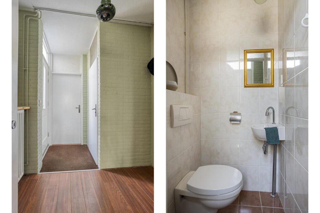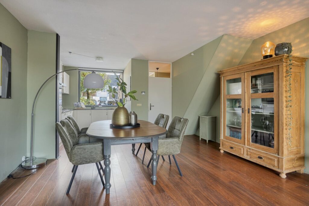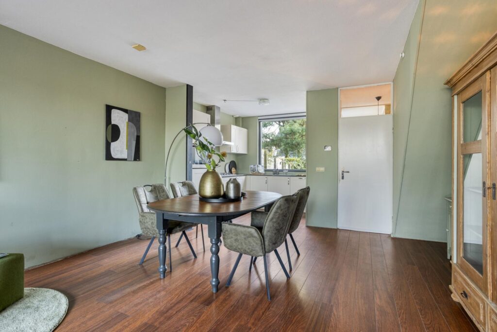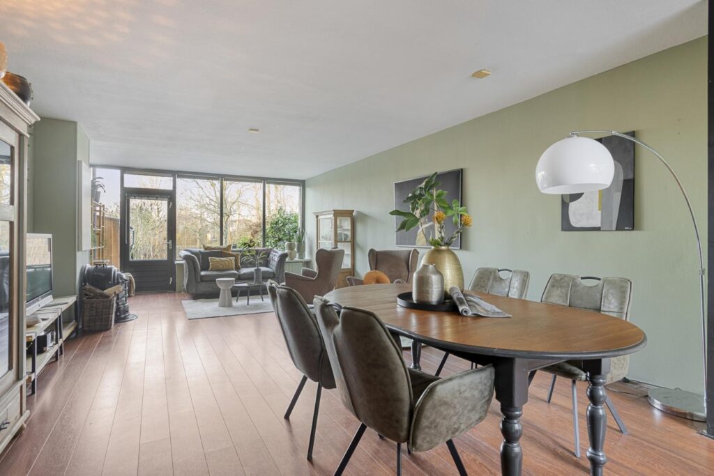 Bij binnenkomst tref je een prettige hal met toilet en toegang tot de woonkamer. De ruime woonkamer is uitgebouwd en biedt een fijne leefruimte met veel licht en volop mogelijkheden voor een gezellige zithoek en eethoek.