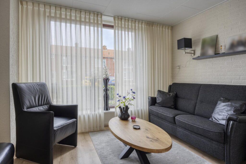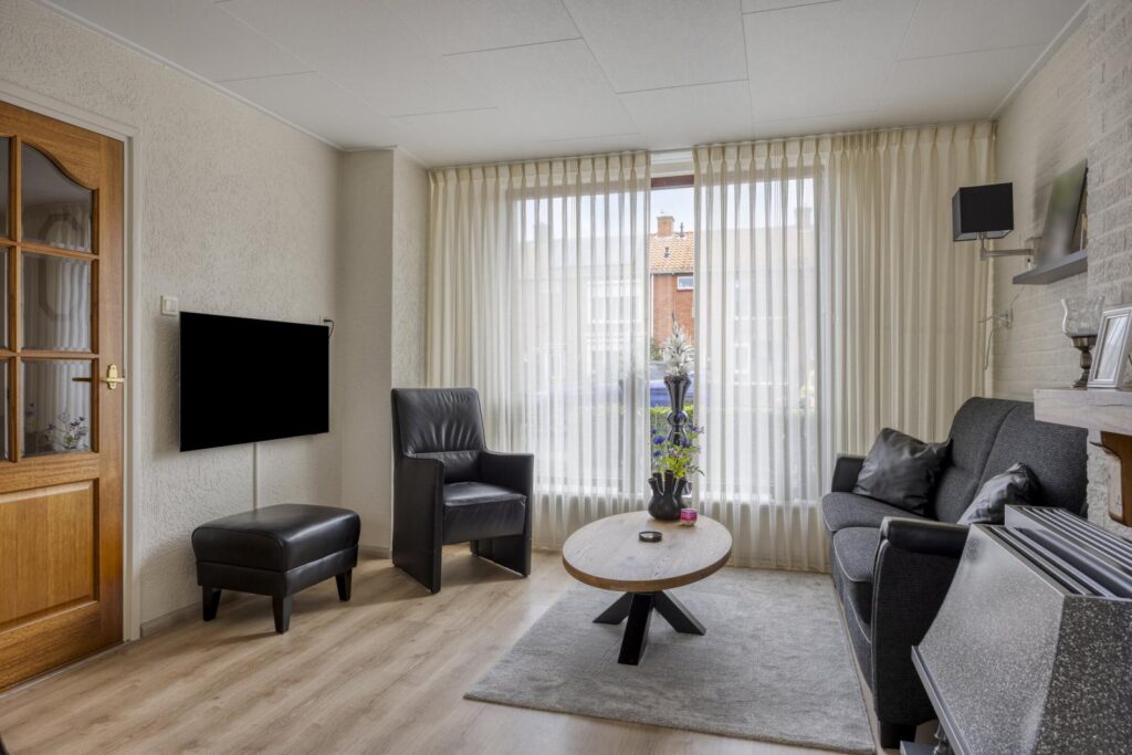 De doorzonwoonkamer is licht en gezellig en biedt voldoende ruimte voor een comfortabele zithoek. Aansluitend bevindt zich de keuken, waar je niet alleen kunt koken maar ook gezellig kunt eten: er is namelijk prima plek voor een eettafel.
