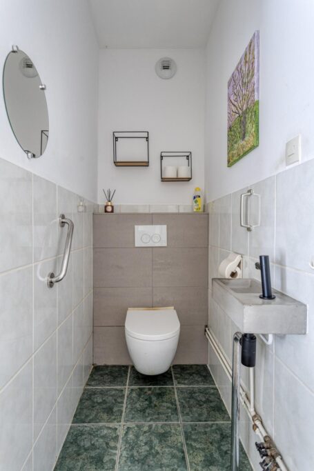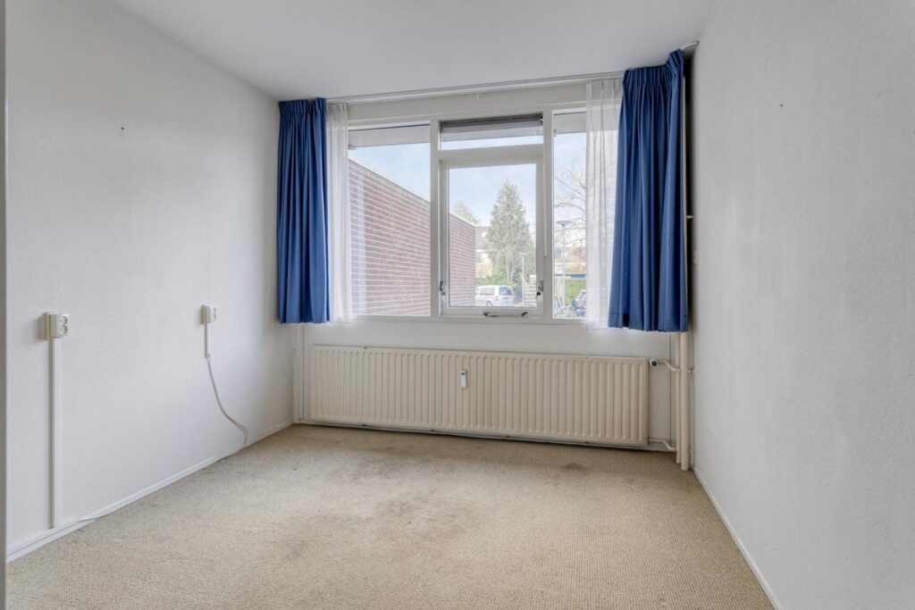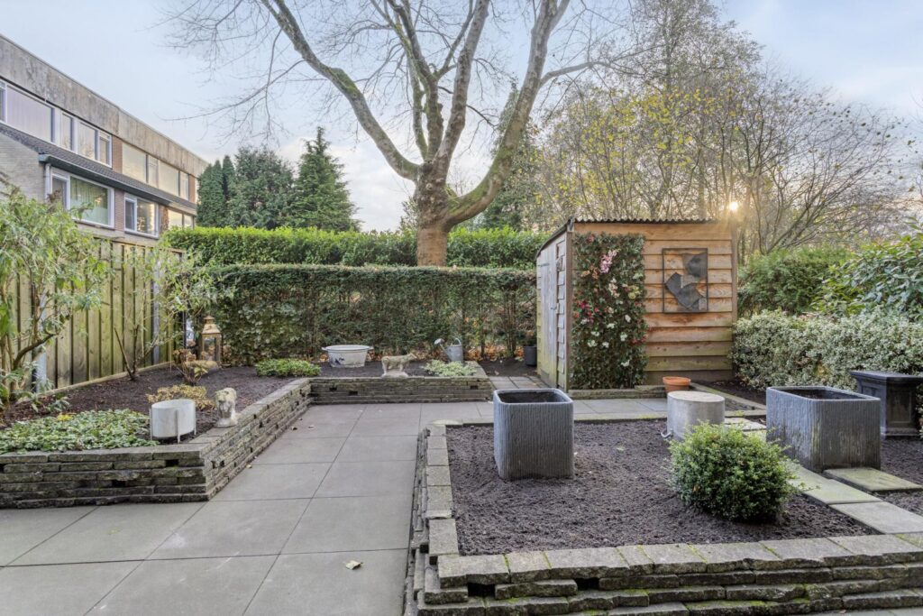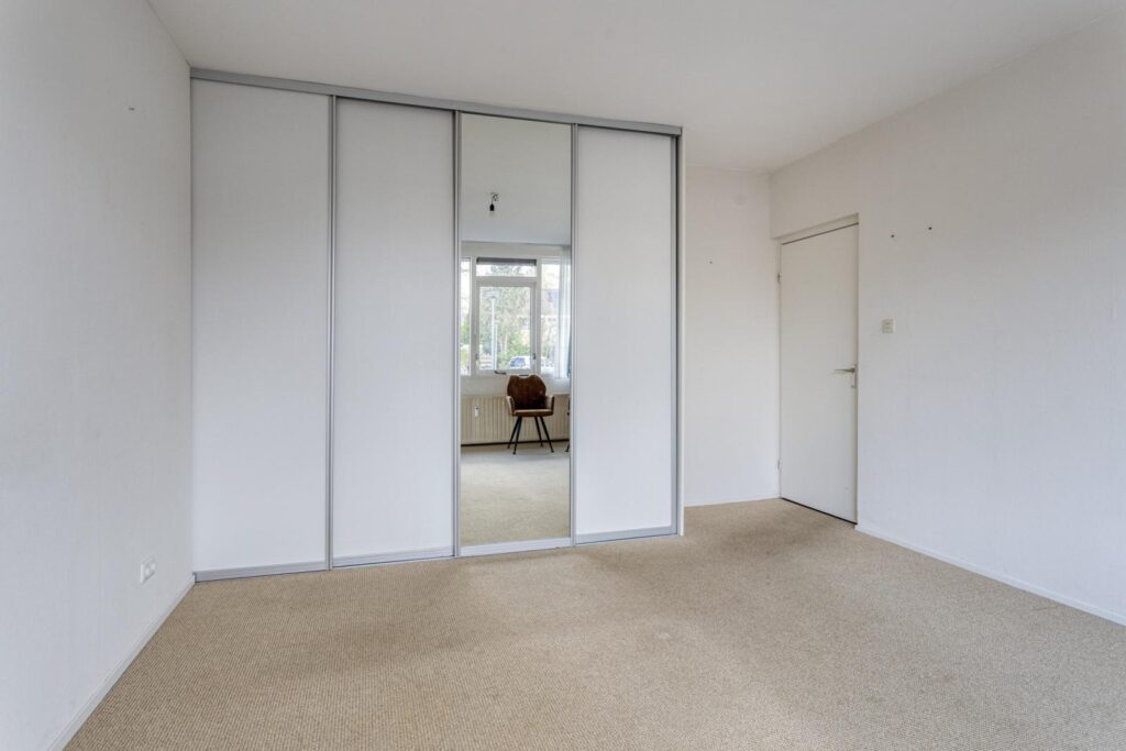 De lichte woonkamer bevindt zich aan de tuinzijde en biedt prettig uitzicht door de grote raampartijen. Vanuit de woonkamer loop je direct de eigen, deels beschutte tuin/terras op; een fijne plek om te ontspannen of om buiten te eten.